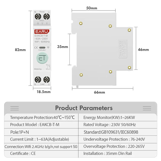 Tuya WiFi Smart Circuit Breaker MCB 1P+N 63A Timer Power Energy kWh Voltage Current Meter Protector Voice Remote Control Switch