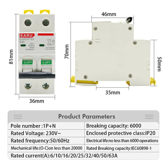 AC 230V 50/60Hz MCB Type C Mini Circuit Breaker Overvoltage and Undervoltage Protection 6A 10A 16A 20A 25A 32A 40A 50A 63A 1P+N