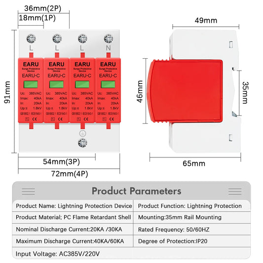 AC 385V SPD 1P 2P 3P 4P 20KA 30KA 40KA 60KA House Lightning Surge Protector Protective Solar PV Low-Voltage Arrester Device