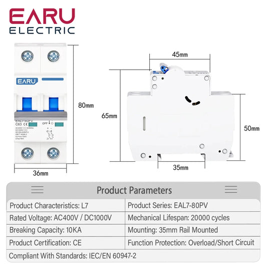 2P DC 1000V AC 400V MCB Solar PV Mini Circuit Breaker 6A-80A Overload Protection Short Circuit Protection Switch Photovoltaic
