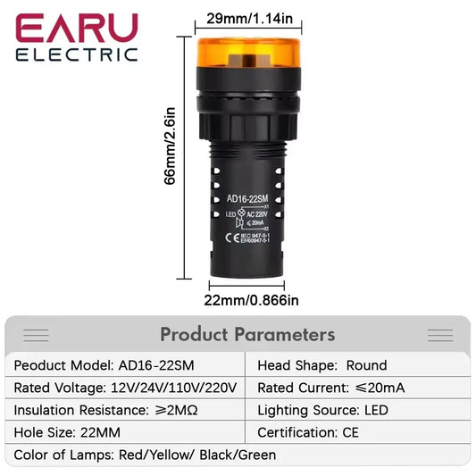 AD16-22SM 22mm Panel Diameter AC DC 12V 24V 110V 220V Flash Signal Light Red LED Active Buzzer Beep Alarm Indicator Green Yellow
