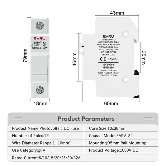 1P 2P 3P 4P Solar DC Fuse Holder High Voltage Solar PV DC 1000V Photovoltaic 6A-32A Photovoltaic System Protection Protector gPV