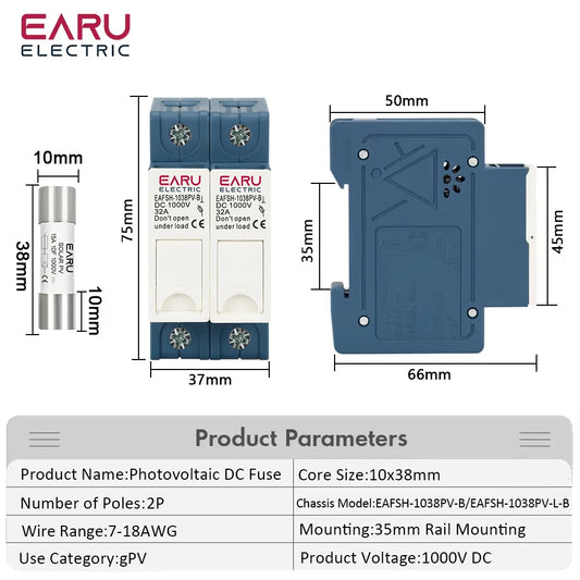 One Set 2P DC Fuse Holder 10*38mm High Voltage Solar PV 1000V 6A-32A Base Photovoltaic System Protection Protector gpV Parallel