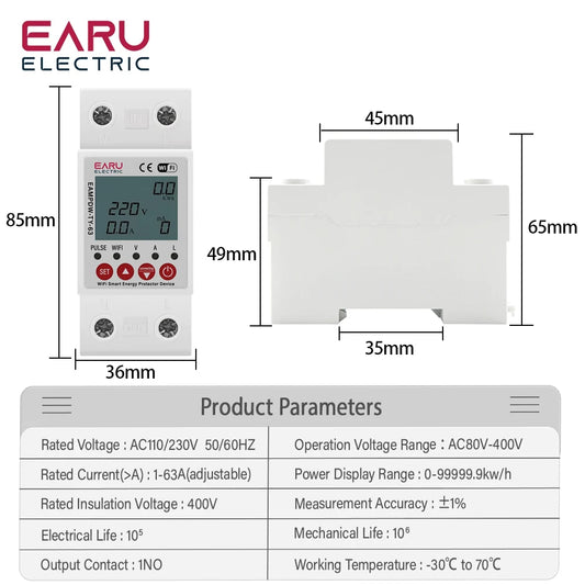 63A AC 230V Tuya WiFi Smart Energy Meter Power kWh Meter Earth Leakage Over Under Voltage Protector Relay Device Switch Breaker