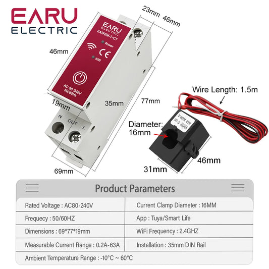 Tuya Smart Life App WiFi Energy Meter AC 110V 230V 63A With Current Transformer Clamp KWh Power Monitor Electricity Statistics
