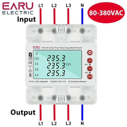 3 Phase 380V 100A Tuya WiFi Smart Bi-Directional Energy Power kWh Meter Over Under Voltage Protector Relay Switch Current Limit