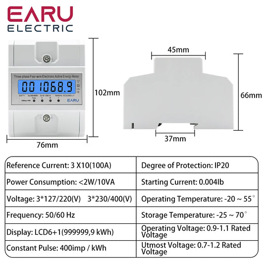Din Rail AC 230 380V 3 Phase 4 Wire Energy Meter Power Consumption Monitor kWh Meter Wattmeter Bivolt 100A 50/60Hz LCD Backlight