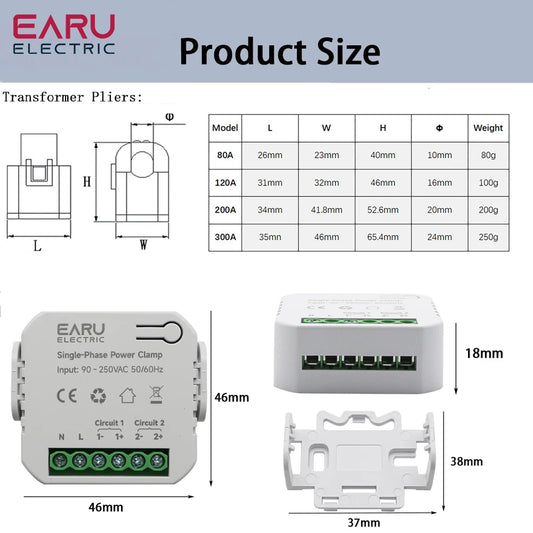 Tuya Smart Life 3 Phase WiFi Energy KWH Meter 80A 300A Power Clamp Current Transformer App Monitor and Record Power Consumption