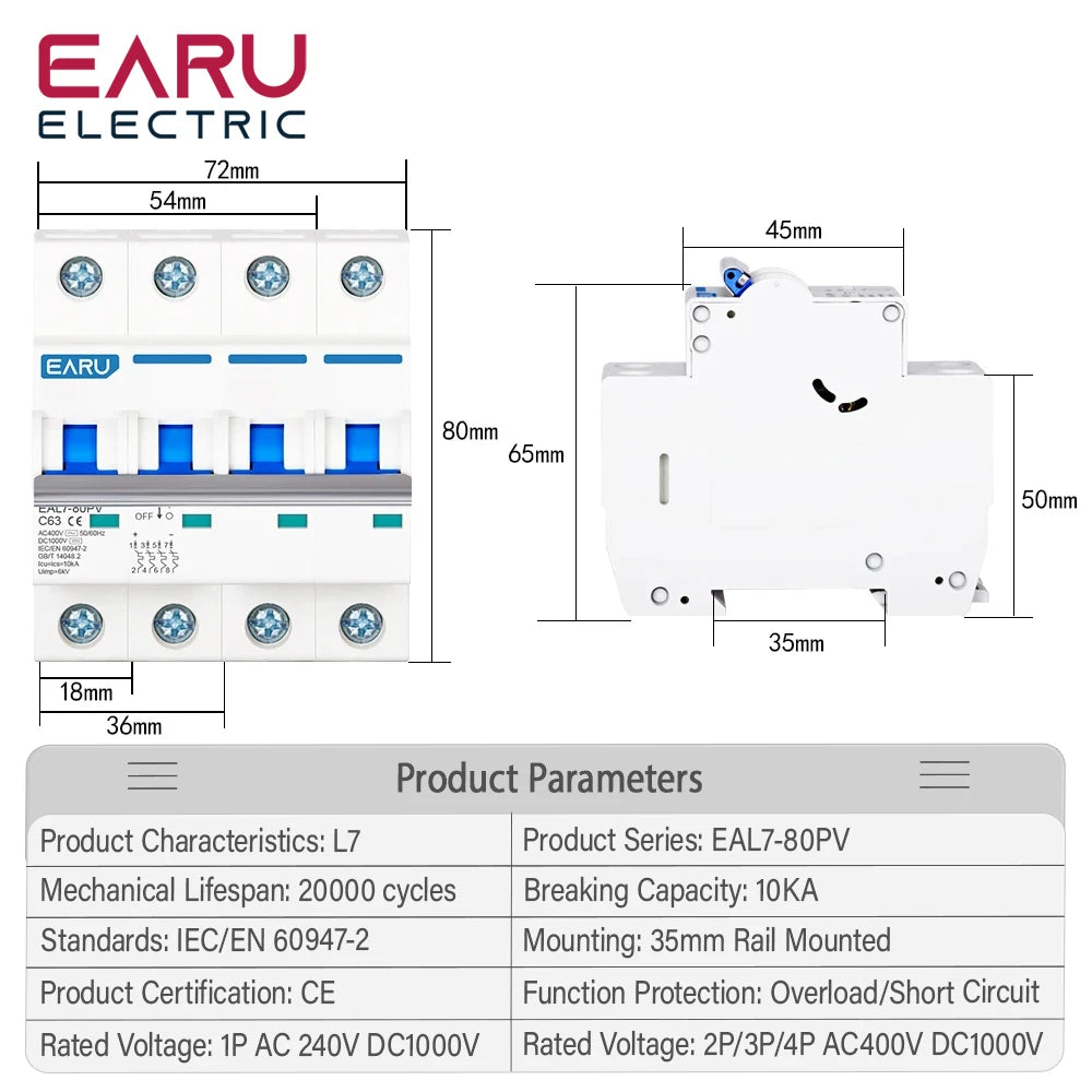 EAL7-80PV Series DC/AC miniature circuit breakers are mainly used for overload and short circuit protection in DC/AC distribution systems and solar photovoltaic systems.