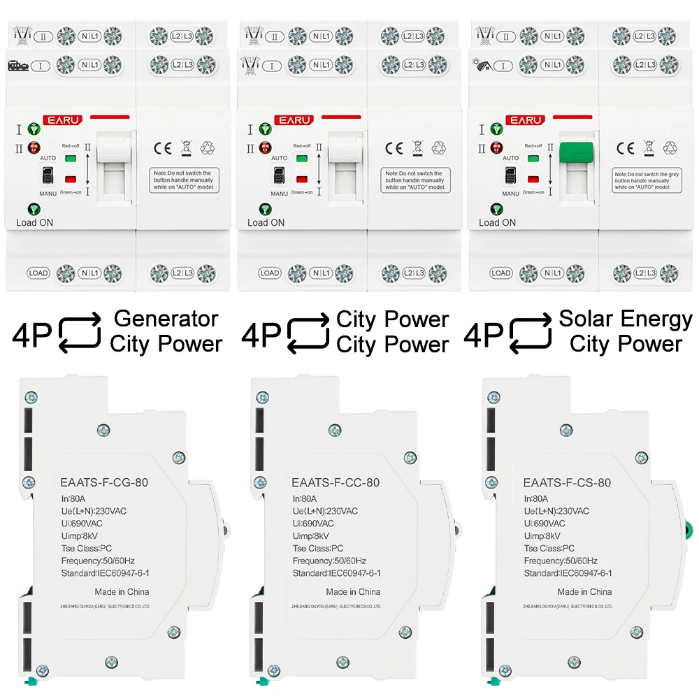 2P 4P 80A AC 230V 110V Automatic Transfer Switch Mini ATS Solar PV Dual Power Electrical Selector Switches Uninterrupted Power