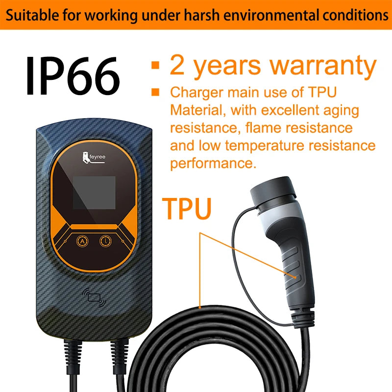 Protección múltiple: El EVSE proporciona resistencia a rayos, fugas, sobretensión, sobrecalentamiento, clasificación IP55 a prueba de agua, resistencia a llamas UL94V-0 y protección contra sobrecorriente para su seguridad. También cuenta con una caja de control con indicadores LED de estado de carga que le ayudan a identificar el estado de funcionamiento del cargador EV.