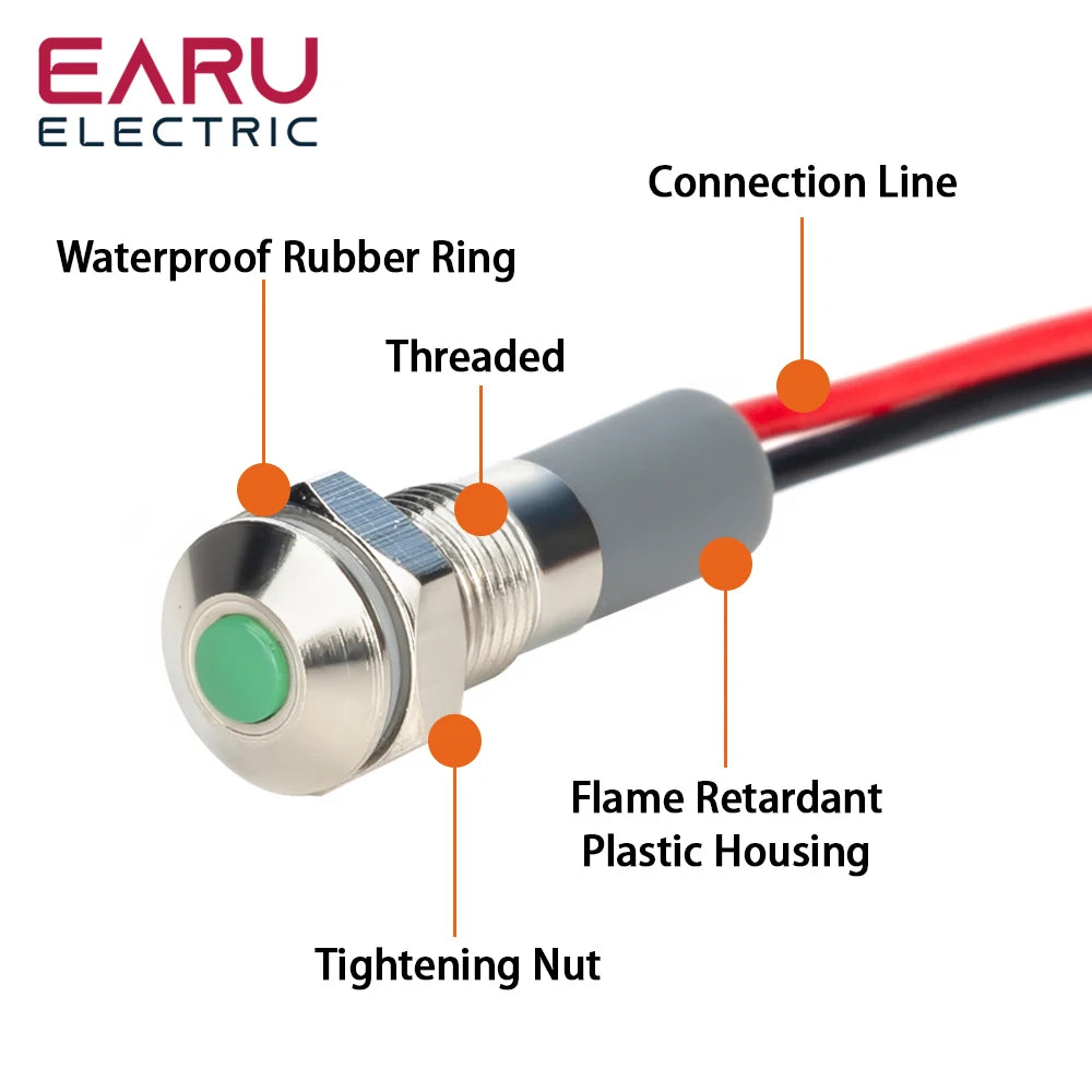 6mm 8mm 10mm 12mm 14mm Warning LED Metal Indicator Light Pilot Wires Switch Waterproof IP65 Signal Lamp 5/12/24/220V Red Green