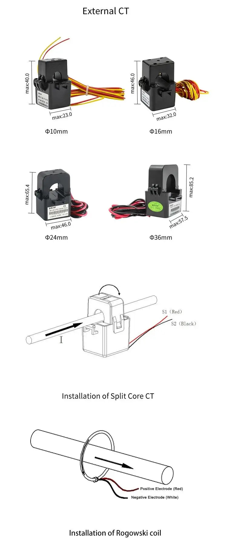 ●Measurement: 1-phase Active Power, Reactive Power, Current, Voltage and etc ●15 Kwp available ●Current Rating: Diameter 10mm,80A (paired with external CTs) Diameter 16mm,120A (paired with external CTs) Diameter 24mm,200A (paired with external CTs) Diameter 36mm,300A (paired with external CTs) ● Communication: RS485 (MODBUS-RTU) ● Application: Using distributed Solar PV and Anti-reflux Inverter ● Display: LCD Display ● Installation: 35mm DIN Rail ● Power Supply: 85~265V AC or 100~350V DC ● Standard&Certificate: CE |