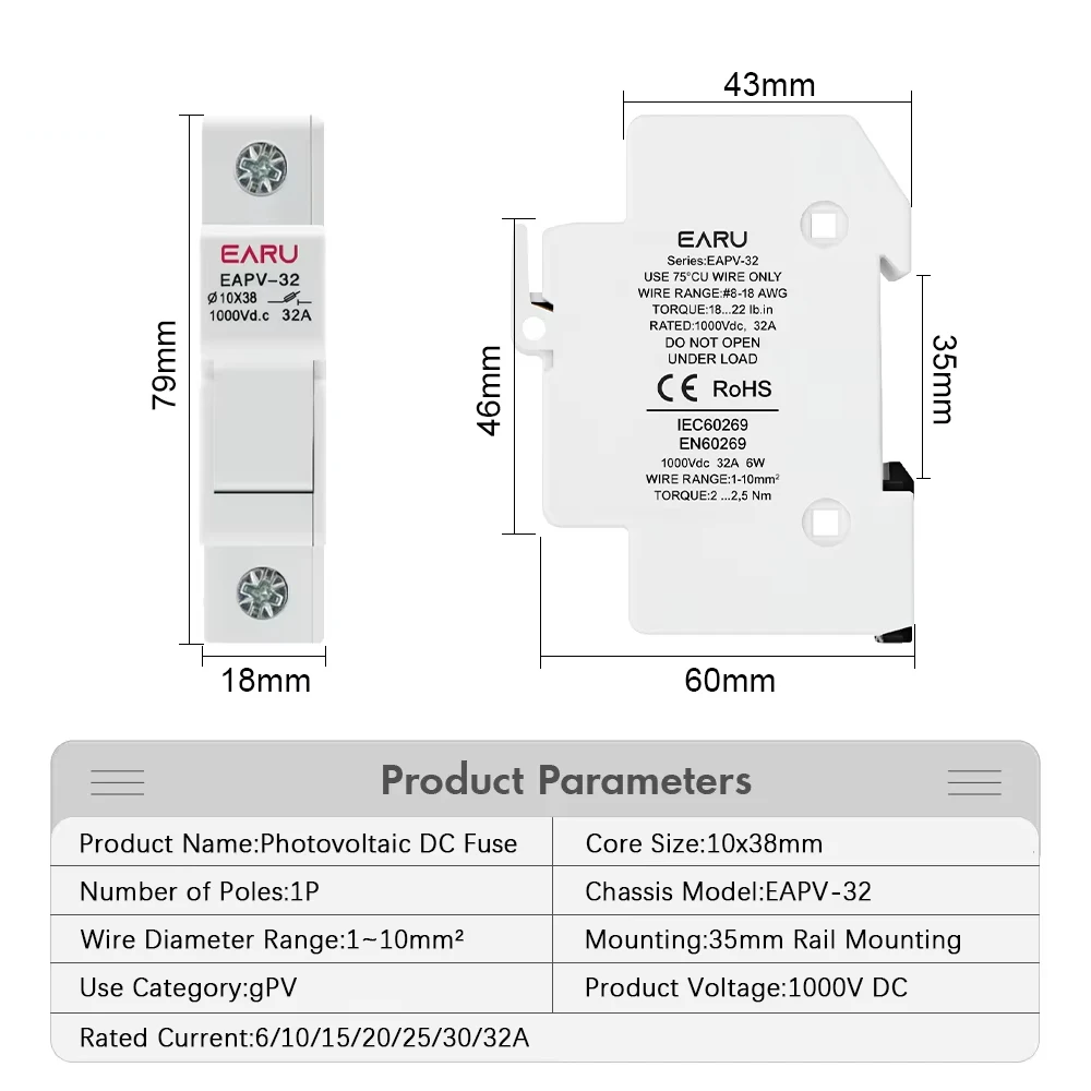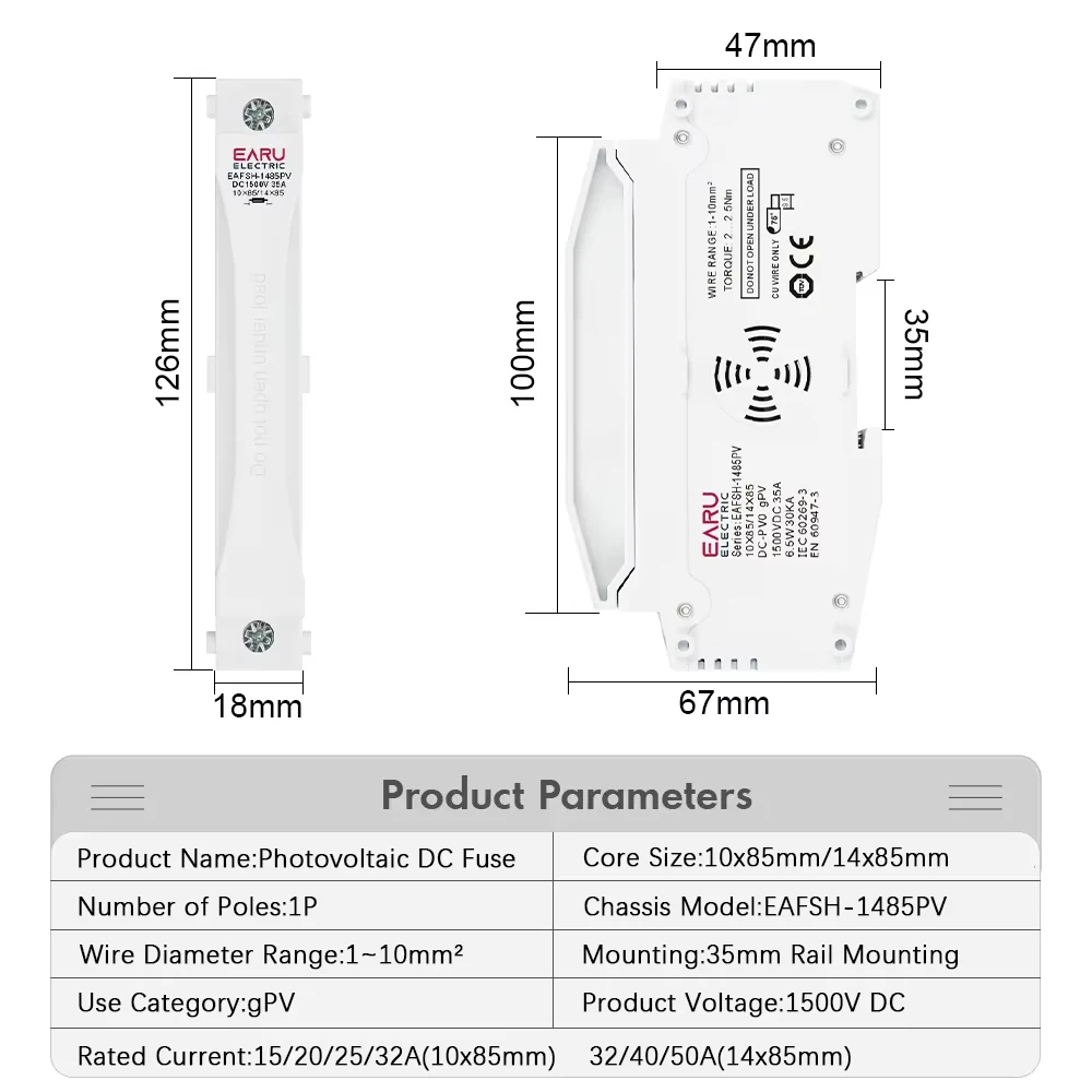 Din Rail Solar Fuses DC 1000V 1500V PV Photovoltaic 20A 25A 30A Fuse Holder Base for Solar System Short Circuit Protection gPV