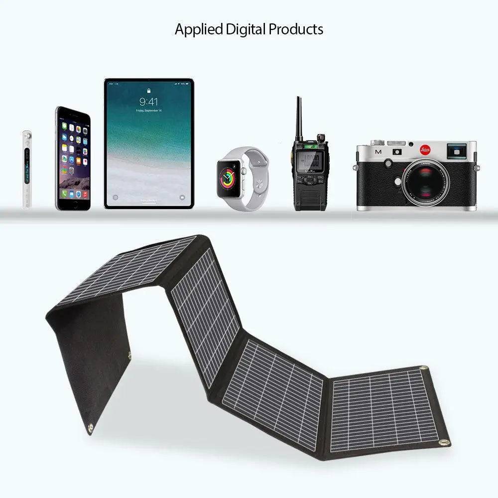 Este panel solar plegable de 28 W es adecuado para casi todos los dispositivos Android de 5 V o dispositivos Apple si tienen un cable original adicional, no para el iPad de Apple. Nuestro cargador de teléfono solar no puede almacenar electricidad, despliéguelo bajo la luz solar directa al aire libre y luego conéctelo a su dispositivo. Nota: nuestro cargador solar no es compatible con portátiles ni iPad Pro.