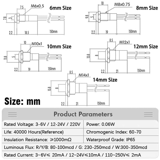 6mm 8mm 10mm 12mm 14mm Warning LED Metal Indicator Light Pilot Wires Switch Waterproof IP65 Signal Lamp 5/12/24/220V Red Green