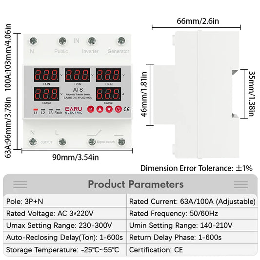 63A 100A 3 Phase 3P+N Phase Selector Adjustable Over Under Voltage Current Protector ATS Automatic Transfer Switch Monitor Relay