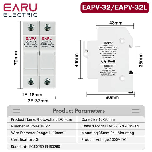 1P 2P Parallel Din Rail DC Fuse Holder 10*38mm High Voltage Solar PV 1000V Base Photovoltaic System Protection Protector gpV