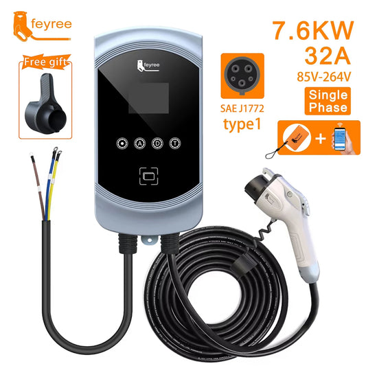 feyree EV Charger Type1 Cable j1772 Socket 32A 40A 50A Single Phase EVSE Wallbox Charging Station APP Control for Electric Car