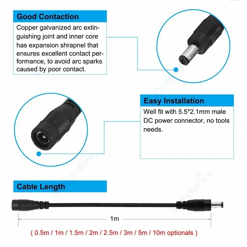 The 5.5mm 2.1mm DC Extension Cord 5V 12V 22AWG 3A 1/2/3/5/10m Male Female Jack Power Cable is designed for versatility and reliability, making it the ideal choice for your CCTV security camera and LED strip light installations. With multiple length options from 0.5m to 10m, this cable caters to various distance requirements, ensuring your devices are powered effectively.