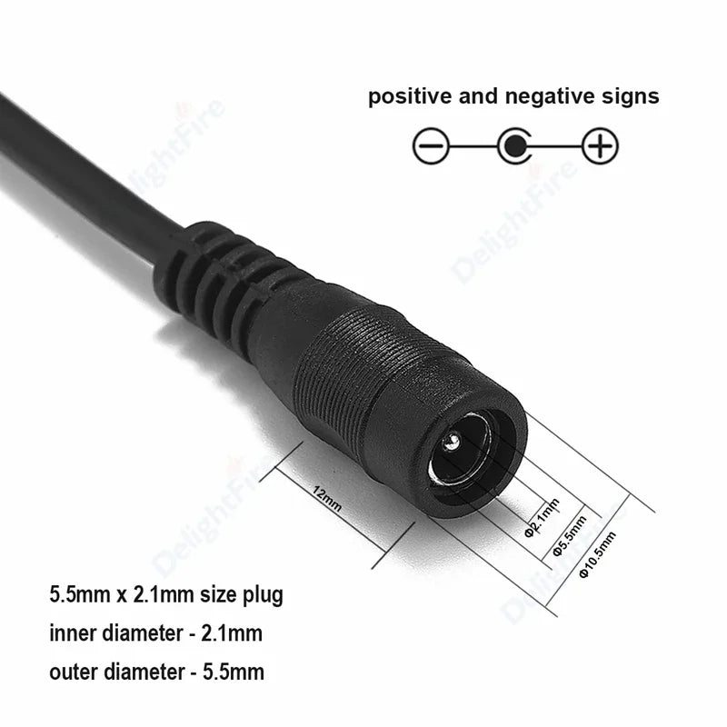 - DC Connector Dimensions: 5.5mm outside diameter, 2.1mm inside diameter