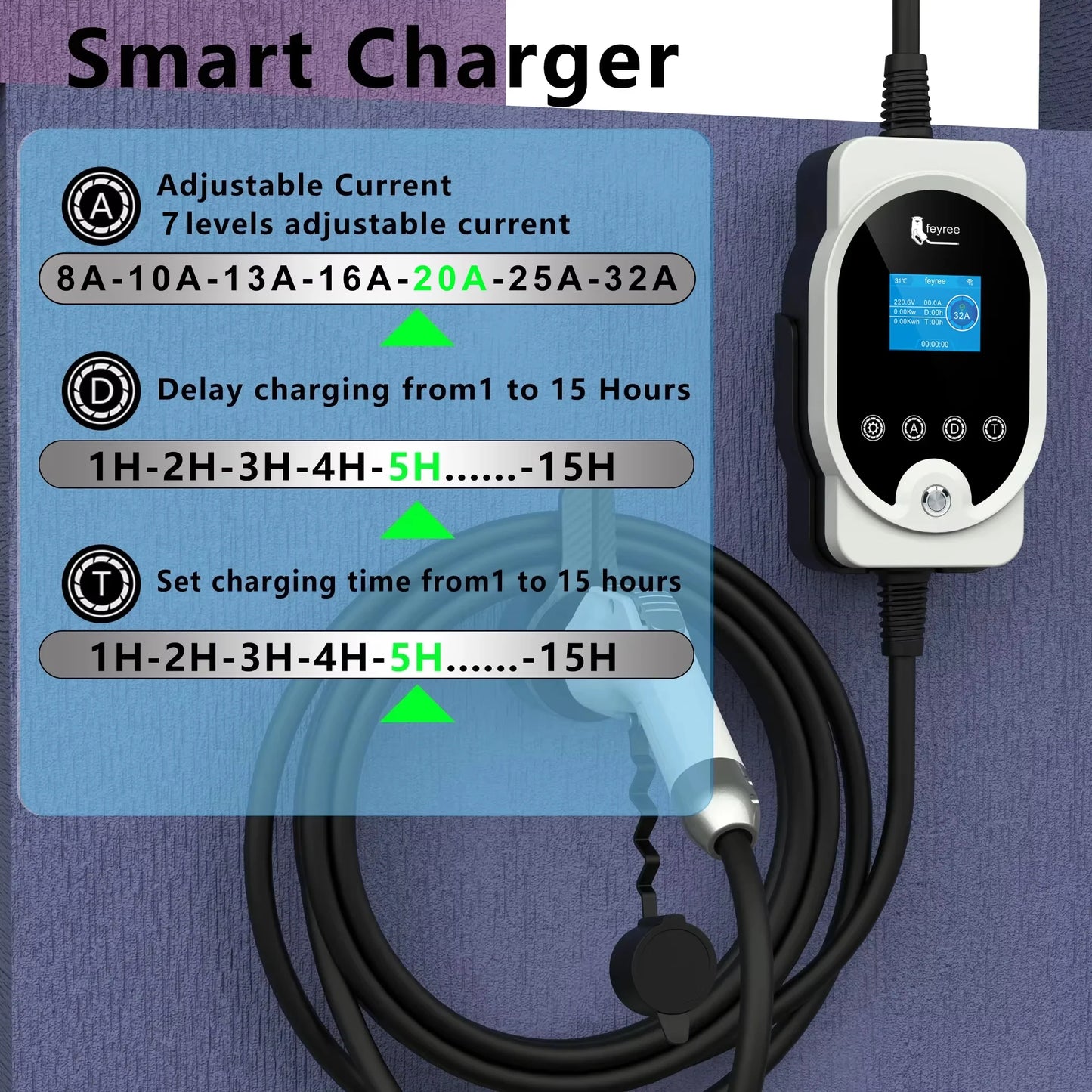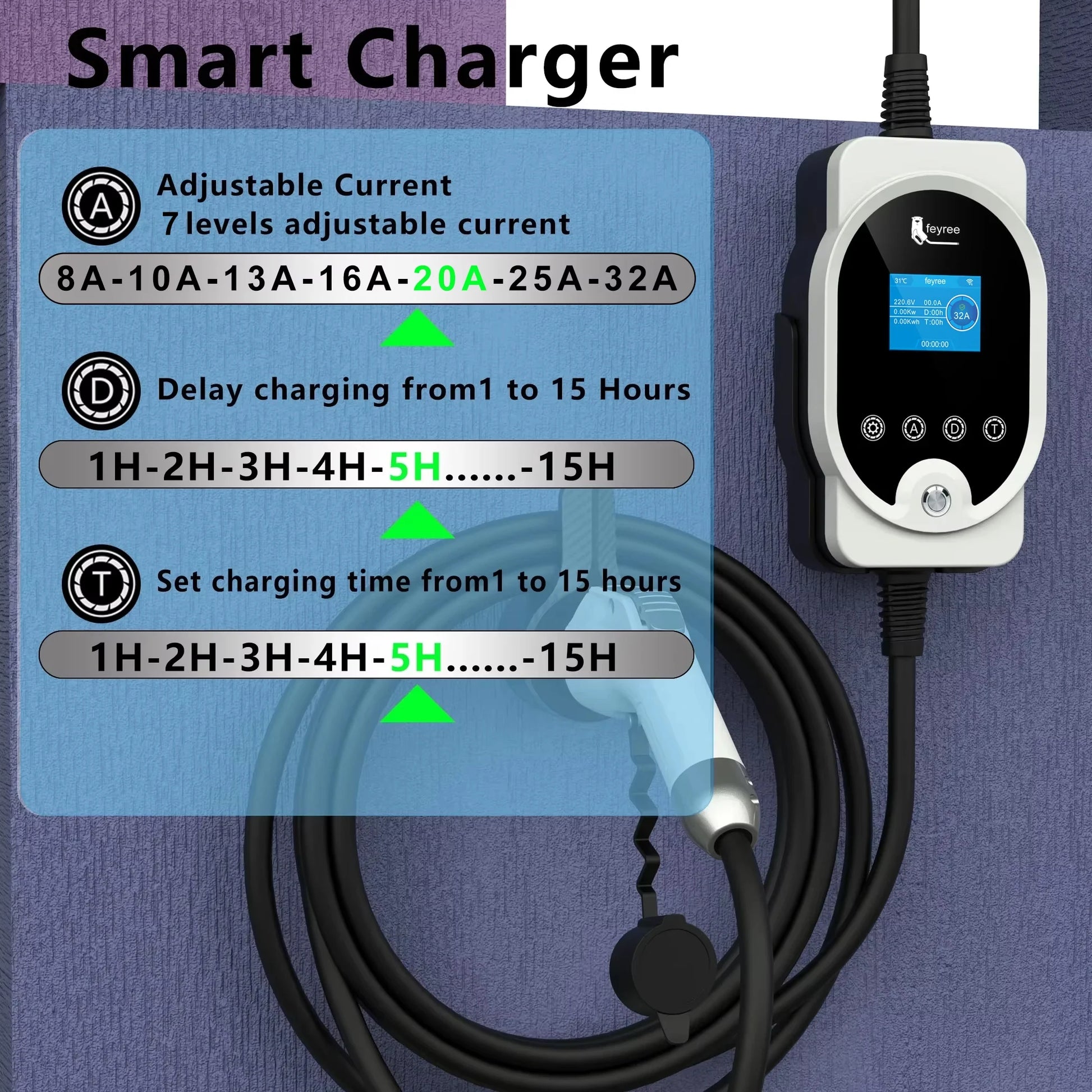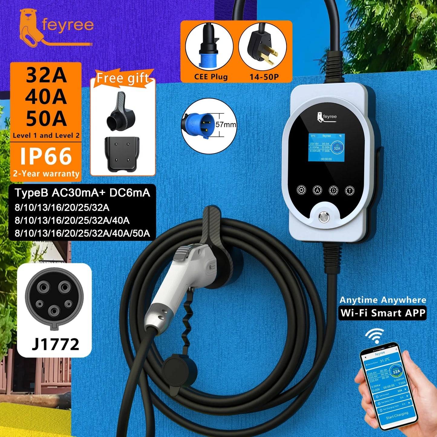 ⚡ feyree Portable EV Charger Type1 Plug 32A 40A 50A EV Fast Charging Cable 5m Electric Car Charging Station wallbox Adjust Current