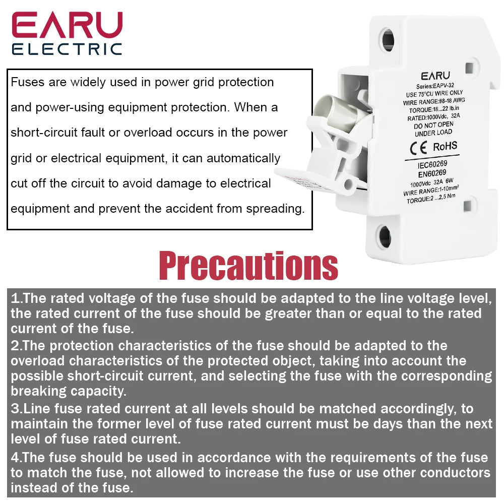 This holder is suitable for PV fuses rated 6A, 10A, 15A, 20A, 25A 30A.32A. The maximum voltage is 1000V. The fuse holder can be combined with the following PV String Fuses which is essential protection for solar panels.