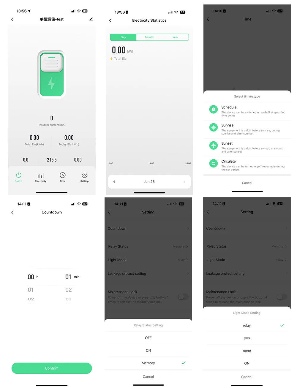 2. In the mobile APP can display: Today Energy KWh,Voltage,Current,Power,Total Energy KWh. Residual current protection