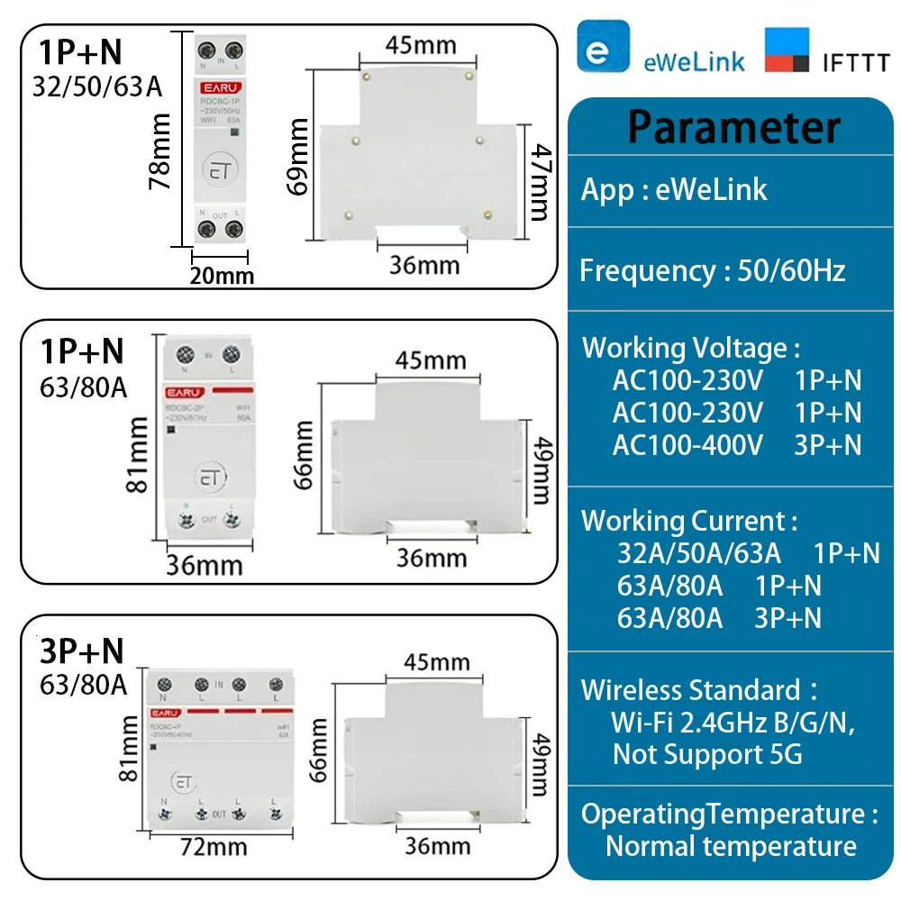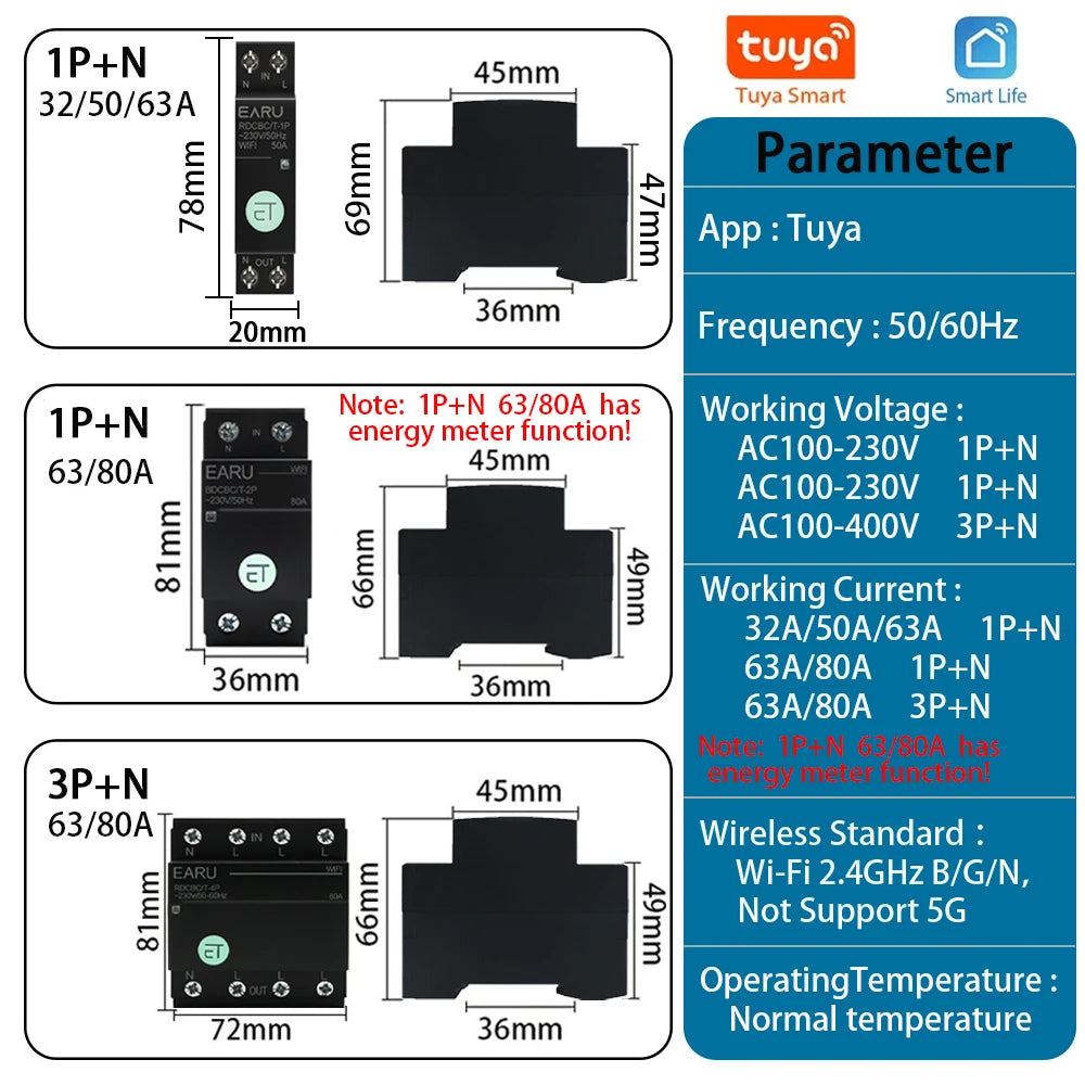 Notice: This is relay type, have no short circuit ,overload protection Only Single phase 63/80A Tuya(Black) has energy meter function!