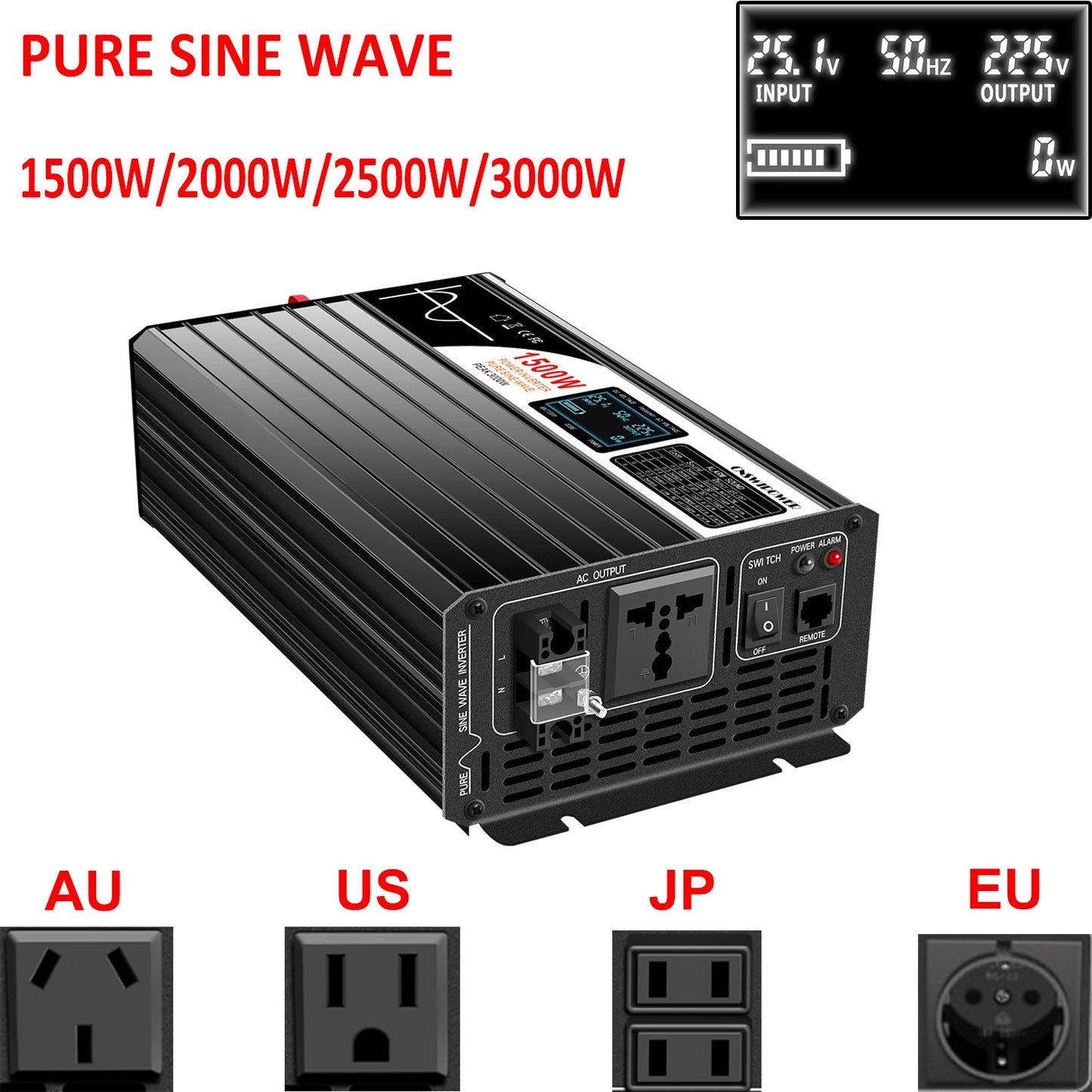 Upgrade your system with our high-performance 1500W 2000W 2500W 3000W pure sine wave solar power inverter 12V/24V/48V DC to 110V 220V AC LCD screen. Built for reliability, efficiency and seamless integration with modern setups.