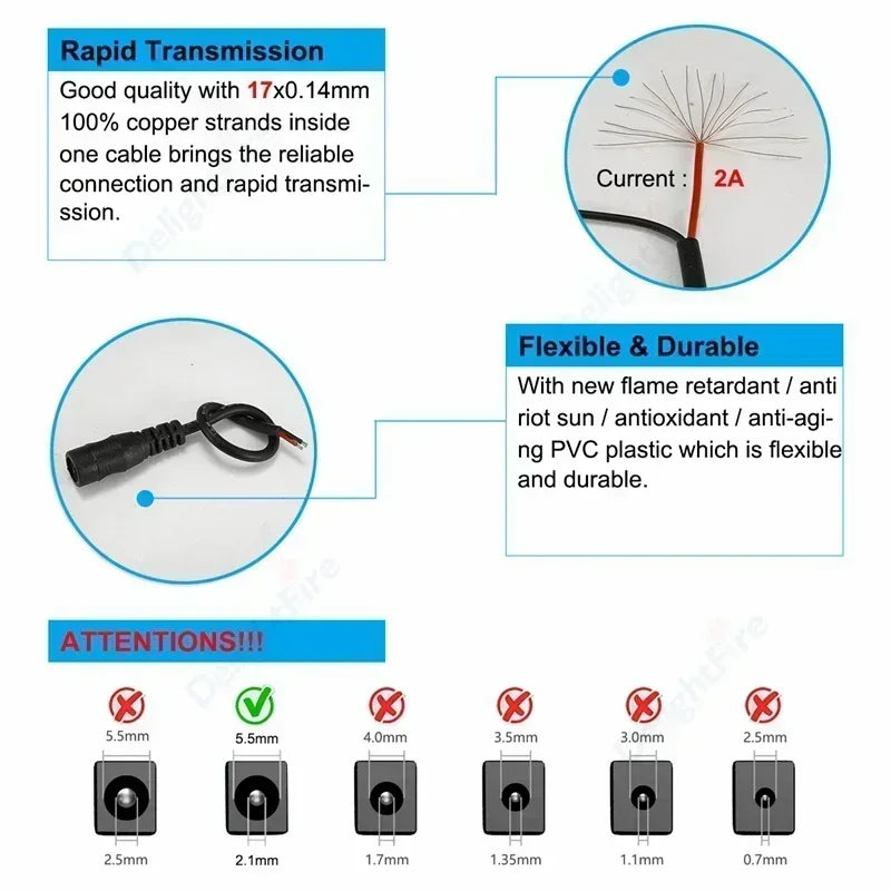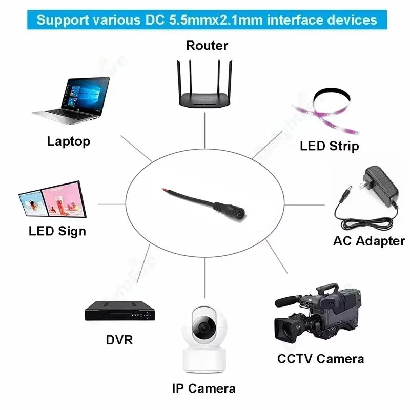 The 20AWG 5A DC Power Pigtail Wires are designed for versatility and reliability. Perfect for powering your CCTV cameras, LED lighting, battery routers, and DVRs, this cable ensures seamless connectivity in various applications!