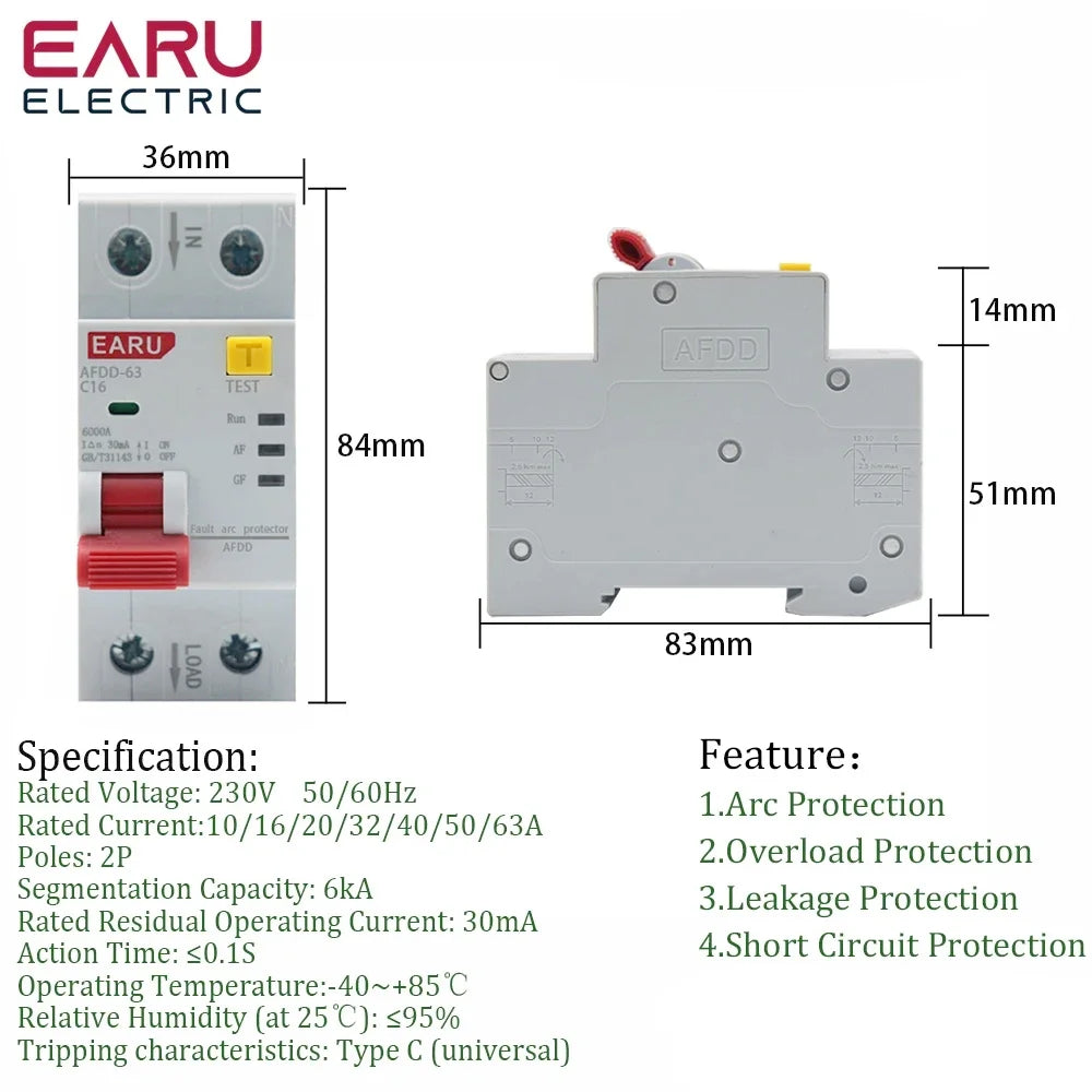 ⚡ 2P 220V AFDD 63 AFCI Arc Fault Protector Device RCBD Circuit Breaker Interrupted Overload Earth Leakage Short Circuit Protection