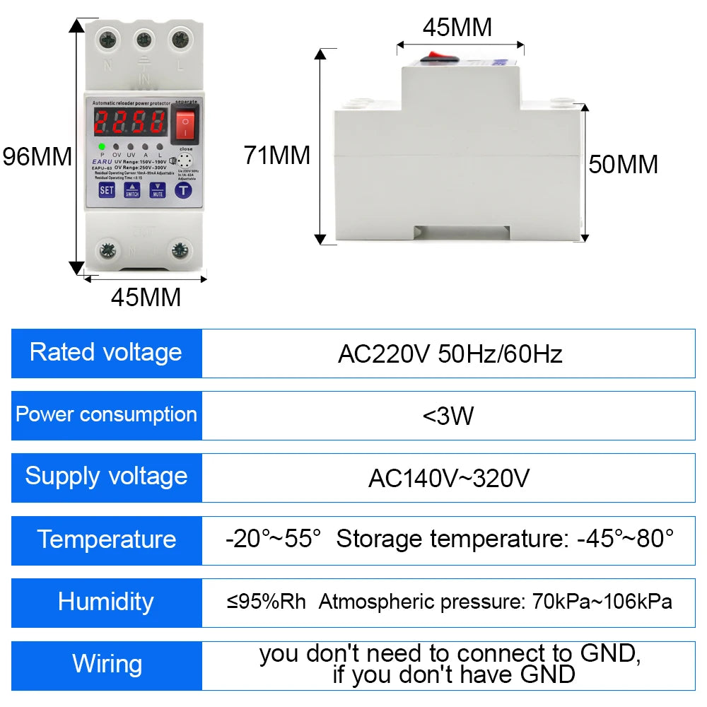 - Main technical parametersRated voltage: AC220V 50Hz/60HzPower consumption: <3WSupply voltage: AC150V~300VLeakage range: 10~99mA Leakage response time: ≤0.1SOvervoltage range: AC250~300V Overvoltage response time: ≤0.1SLow voltage range: AC150~190V Low voltage response time: ≤0.1SOvercurrent range: 1~63A Overcurrent range response time: ≤0.1SShort-circuit current: ≥31ln Short-circuit response time: ≤0.1SError in real-time current, voltage and leakage current: ≤5%Max. failure records: 999Working conditions:Temperature: -20°~55° Storage temperature: -45°~80°Humidity: ≤95%Rh Atmospheric pressure: 70kPa~106kPaVolume: 106X92X70mmWiring:you don't need to connect to GND, if you don't have GNDNote 1: This switch cannot be used as a master breaker. Please install a miniature circuit breaker as an overload short-circuiting fitting in front of the switch.Note 2: Please adjust the current after installation.