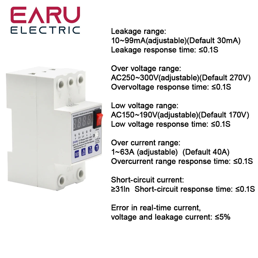63A Automatic Reconnect Circuit Breaker Over And Under Voltage Over Current Leakage Protection Surge Protect Protector Relay
