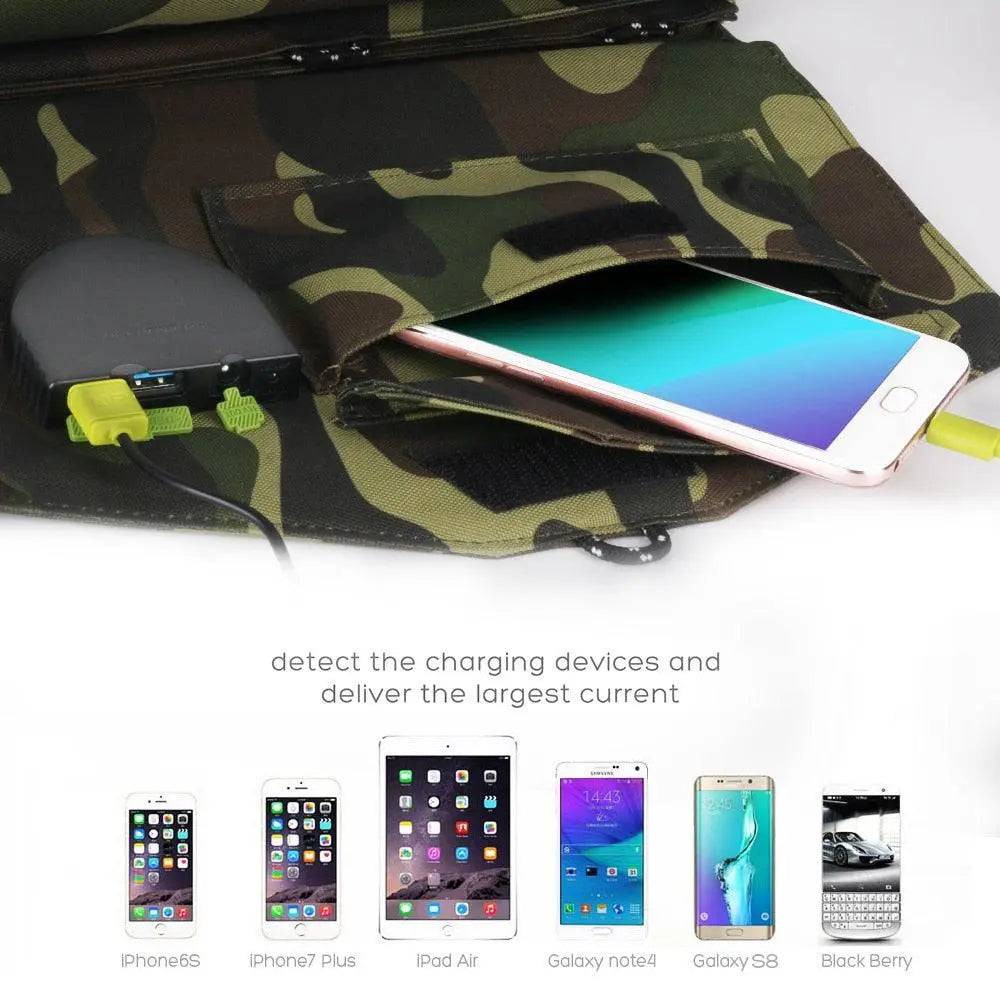The solar panel is FCC, RoHS, CE certified. Short circuit and surge protection technology keep you and your devices safe.