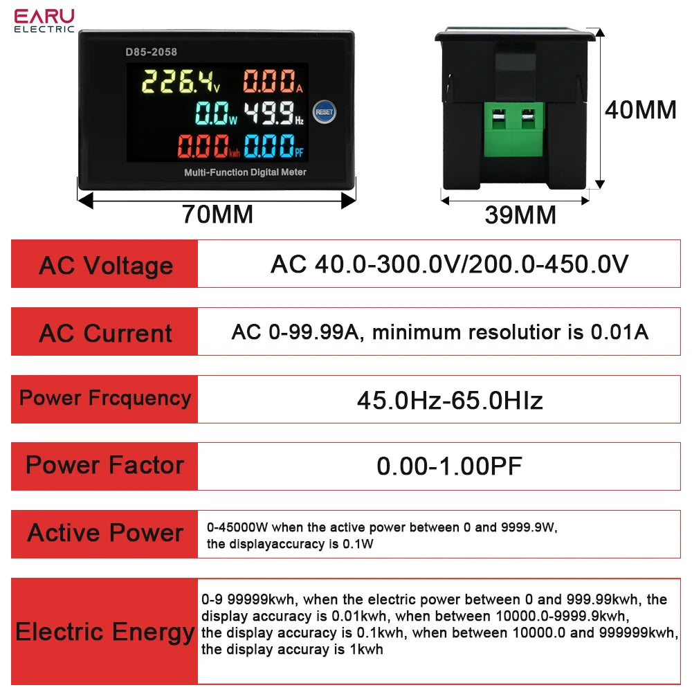 - Range: AC voltage: AC40.0-300.0V/200.0-450.0V(You should select the suitable typc of meter when your making order ) AC current: AC 0-99.99A, minimum resolutios, is 0.01A power frequency: 45.0Hz-65.0Hz power factor : 0.00-1.00PF active power:0-45000Wwhen the active power between 0 and 9999.9W, the display accuracy is 0.1W Electric energy: 0-9 99999kwh,when the electric power between 0 and 999.99kwh, the display accuracy is 0.01kwh, when between 10000.0-9999.9kwh, the display accuracy is 0.1kwh, when between 10000.0 and 999999kwh, the display accuray is 1kwh.