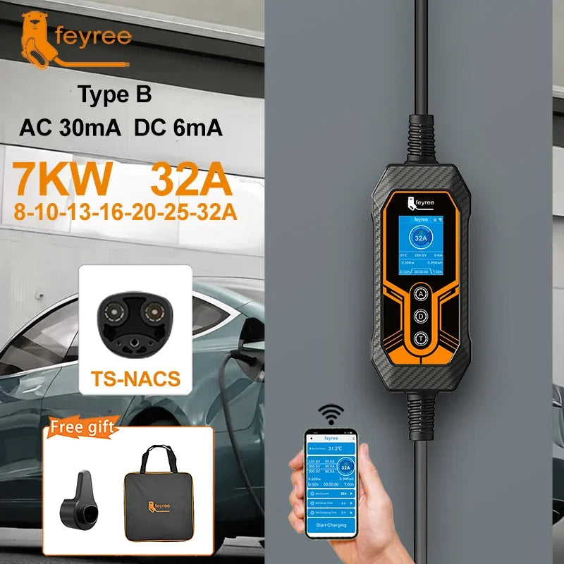 ⚡ feyree EV Charger TS-NACS Socket 32A 7KW 1Phase APP Control EVSE Wallbox Portable Charging Box for Tesla Cars Models 3/Y/S/X