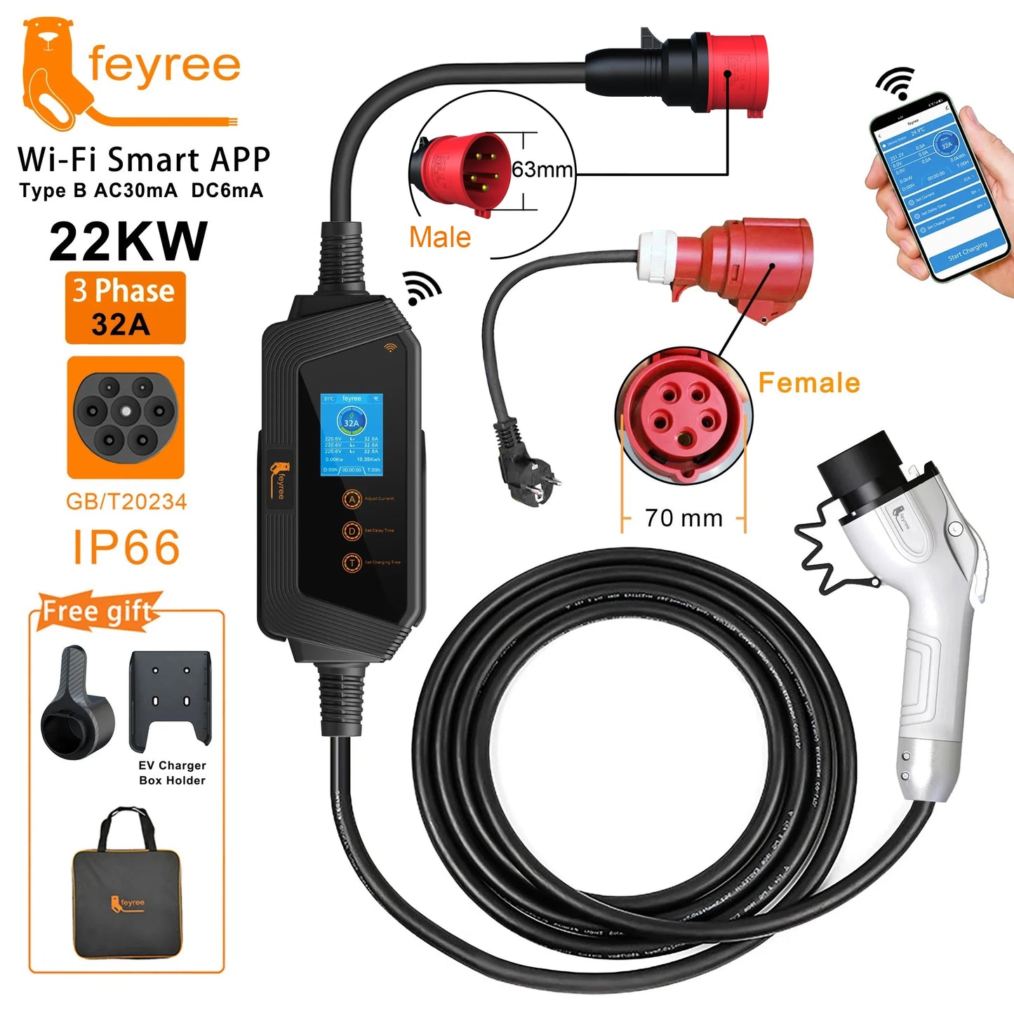 ⚡ feyree Portable EV Charger GBT Plug Fast 22KW 32A 3Phase Adjusting Current Wi-Fi Smart APP Control Electric Car Charging Station