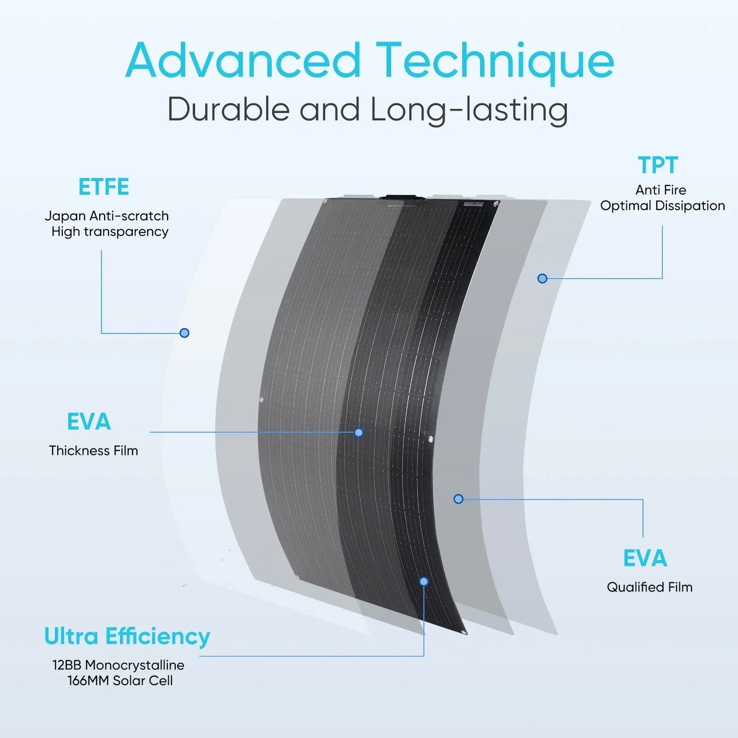 This solar panel kit is engineered for optimal performance, featuring high light transmittance of up to 95%, ensuring maximum solar energy conversion even in less-than-ideal conditions. Its ETFE material is lightweight and durable, reducing the load on your RV or boat, enhancing mobility without compromising on power.