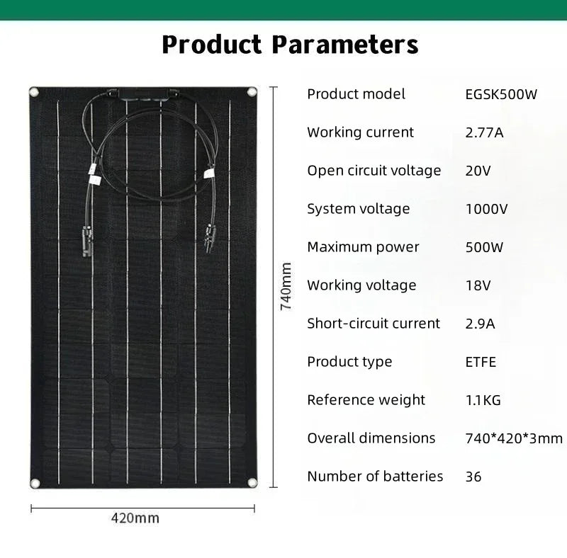 - What are the product specifications? 500W power, 18V/36V options, Monocrystalline Silicon material.