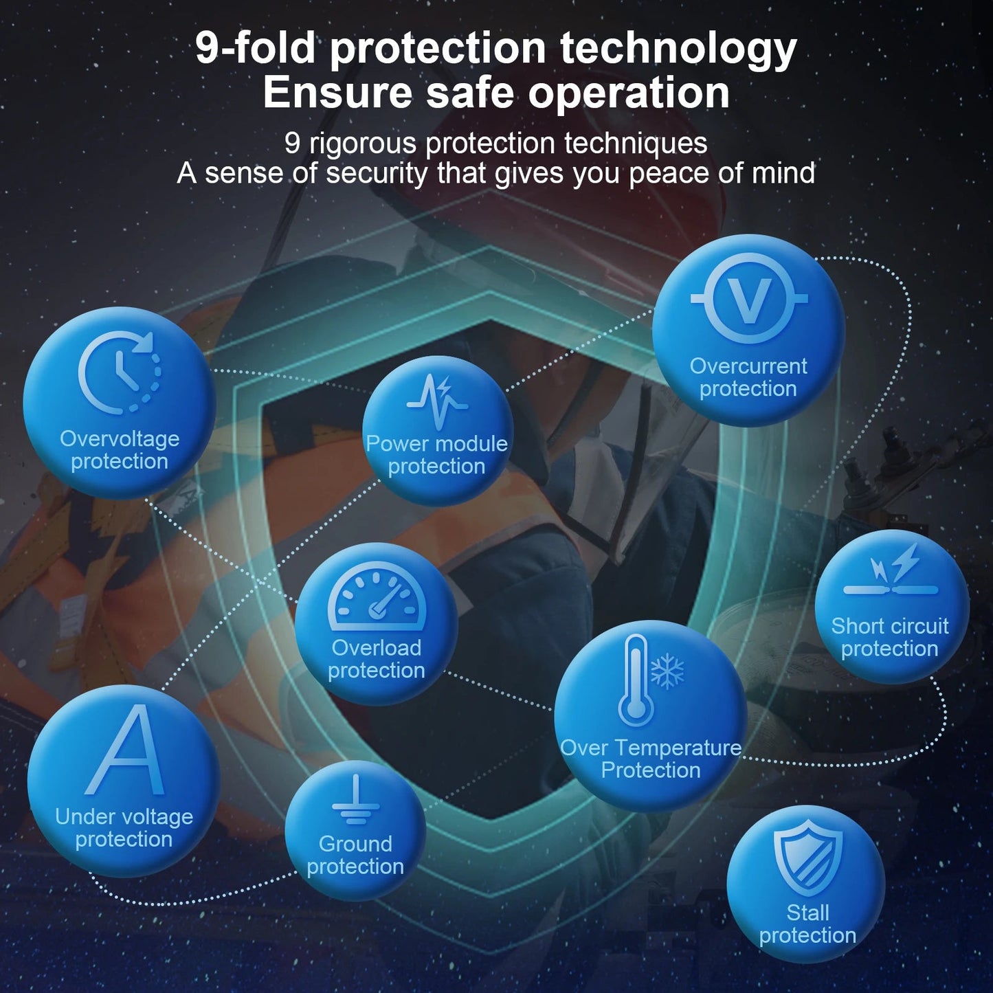Self-developed new generation of general-purpose VFD, which can be used to control asynchronous AC induction motors. It adopts space voltage vector control technology, uses a DSP control system, and strengthens product reliability and stability.